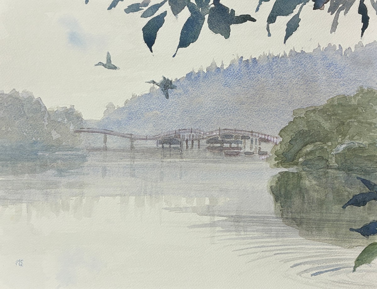 スケッチに行った日、たまたまかすみがかかっていて、いつも以上に風情がありました。それをどう絵として表現するか、苦労しながらまとめました。