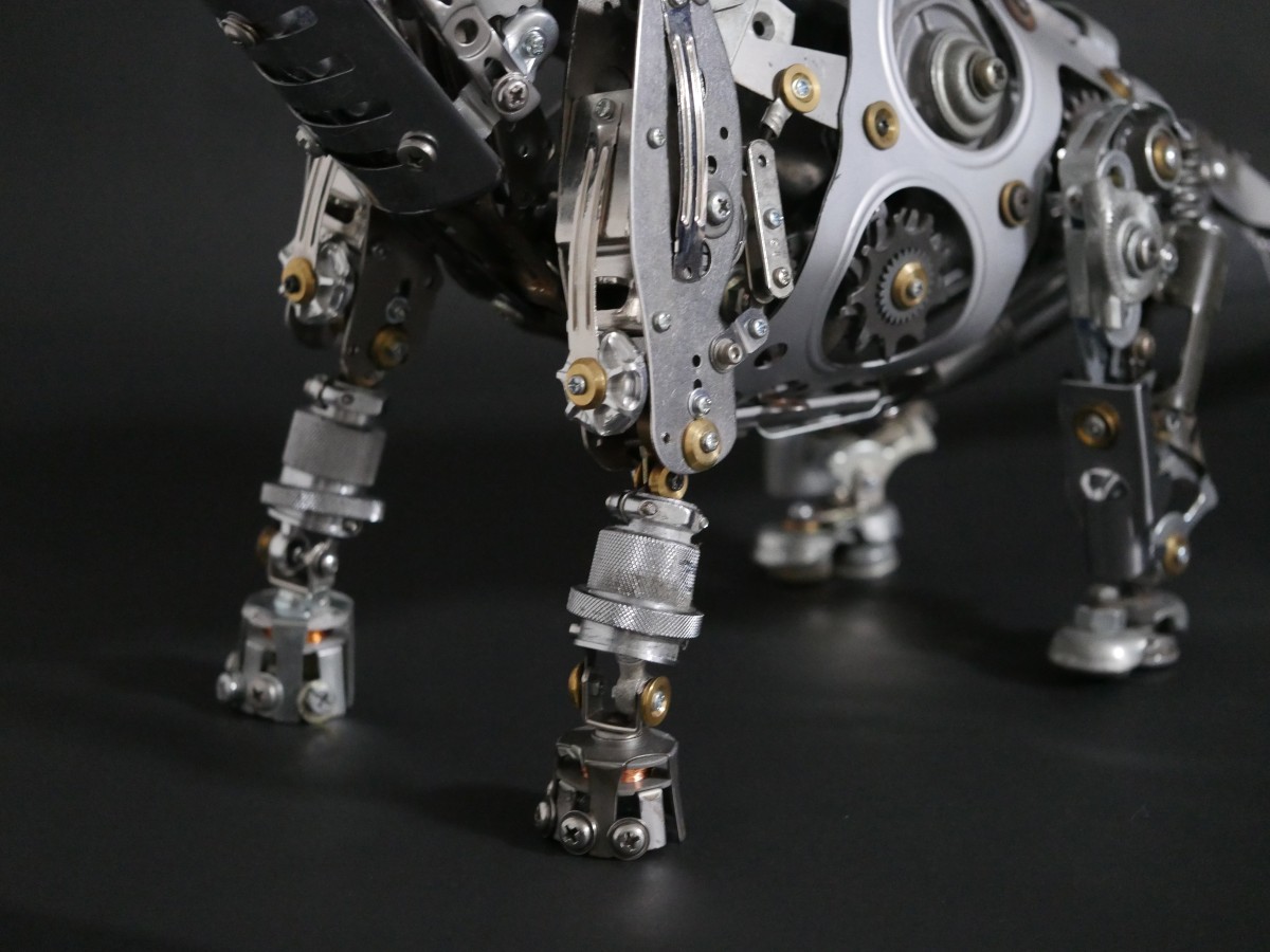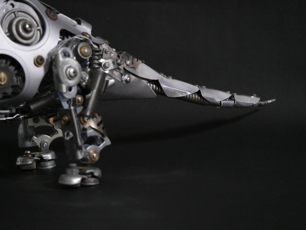 機械的でありながらも生命感を宿す印象を目指し、文献や復元図、実寸大の骨格標本などを参考に各部品に「骨」「筋肉」「皮膚」などの役割を与え、細部まで造形を追求した。
