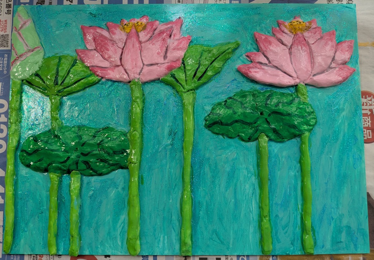 イラストボードを使い粘土で蓮の花を作ってアクリル絵の具で塗りました。