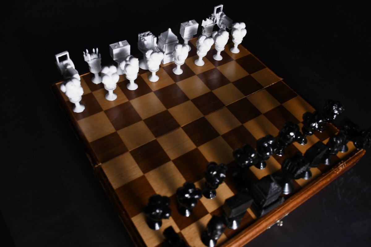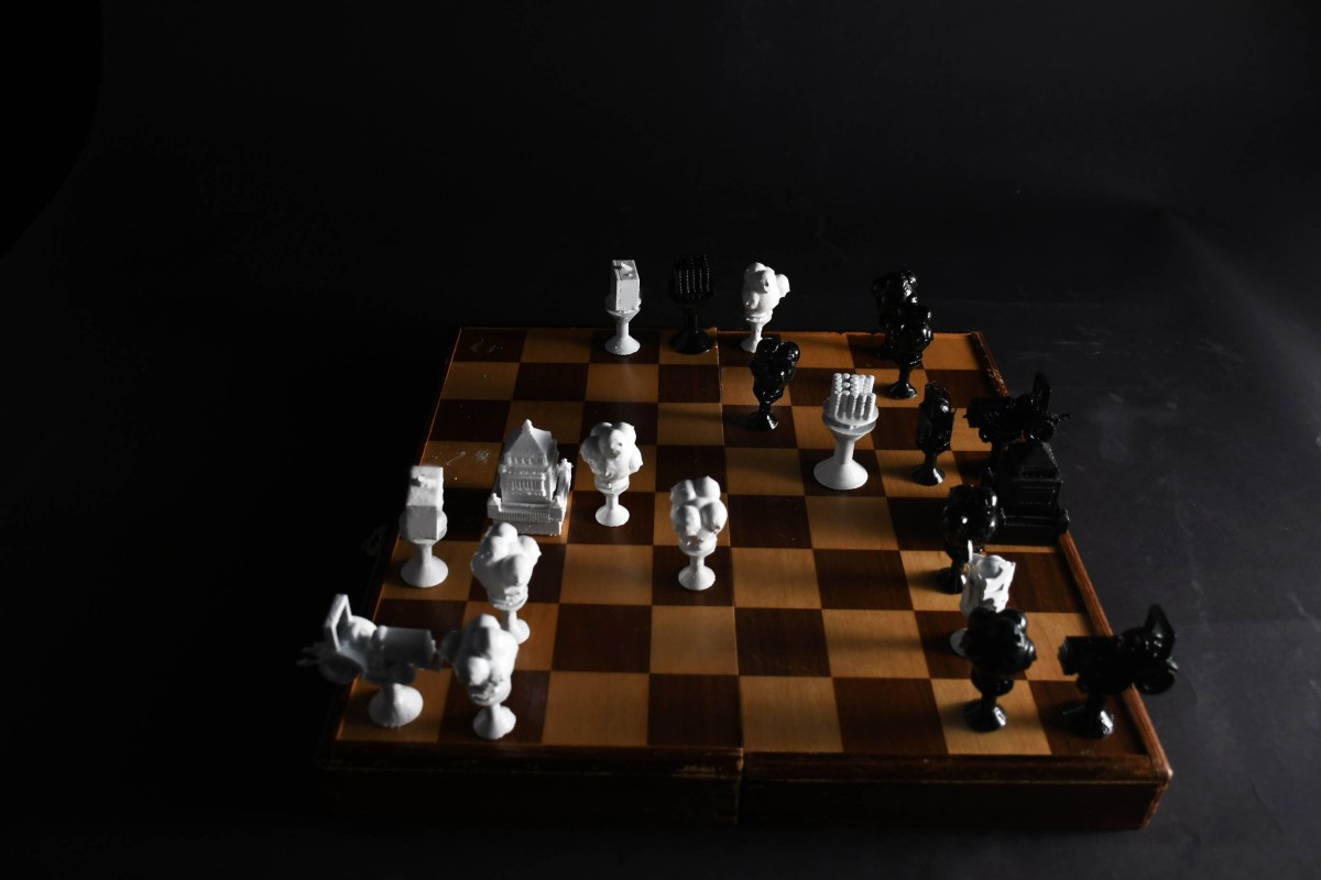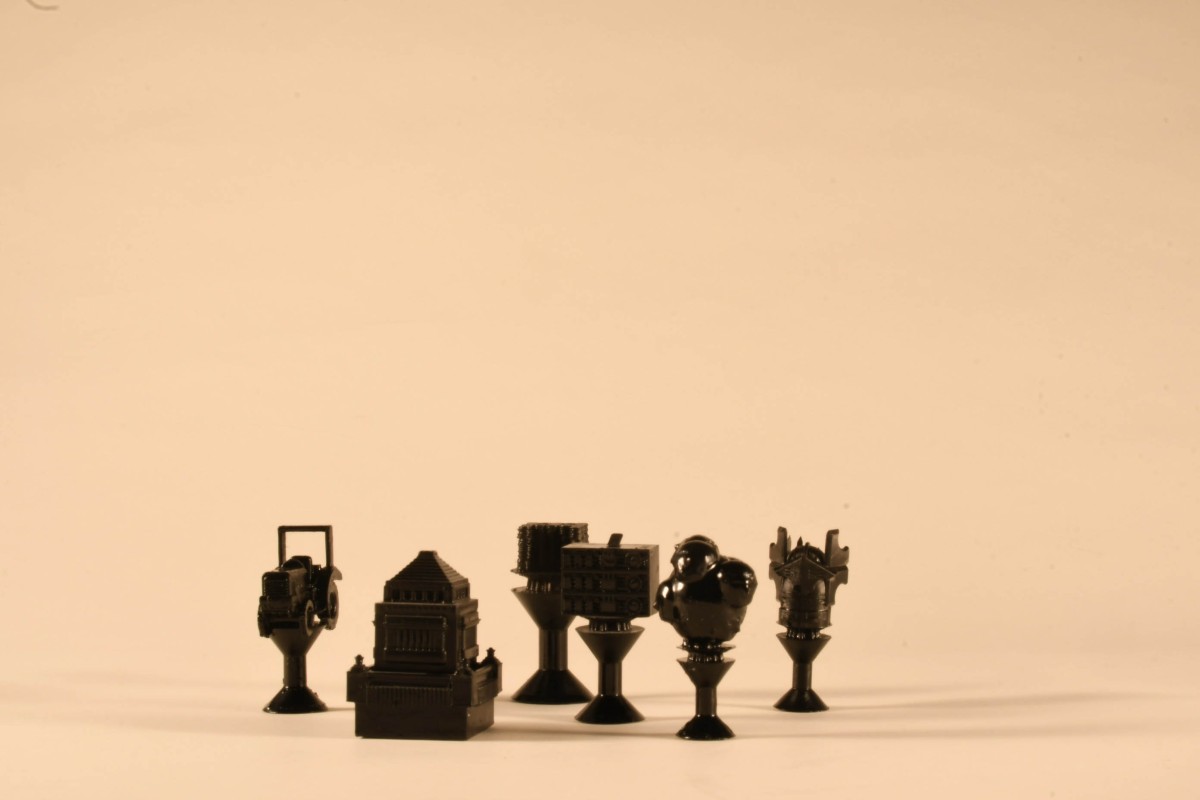 チェスの駒の役を従来のものから、現代日本の役に置き換えた作品。楽しく遊ぶことを望むが、それと同時に何故その役にその役職が当てはまるのか、また何を意味する造形なのか想像を膨らまして欲しい。