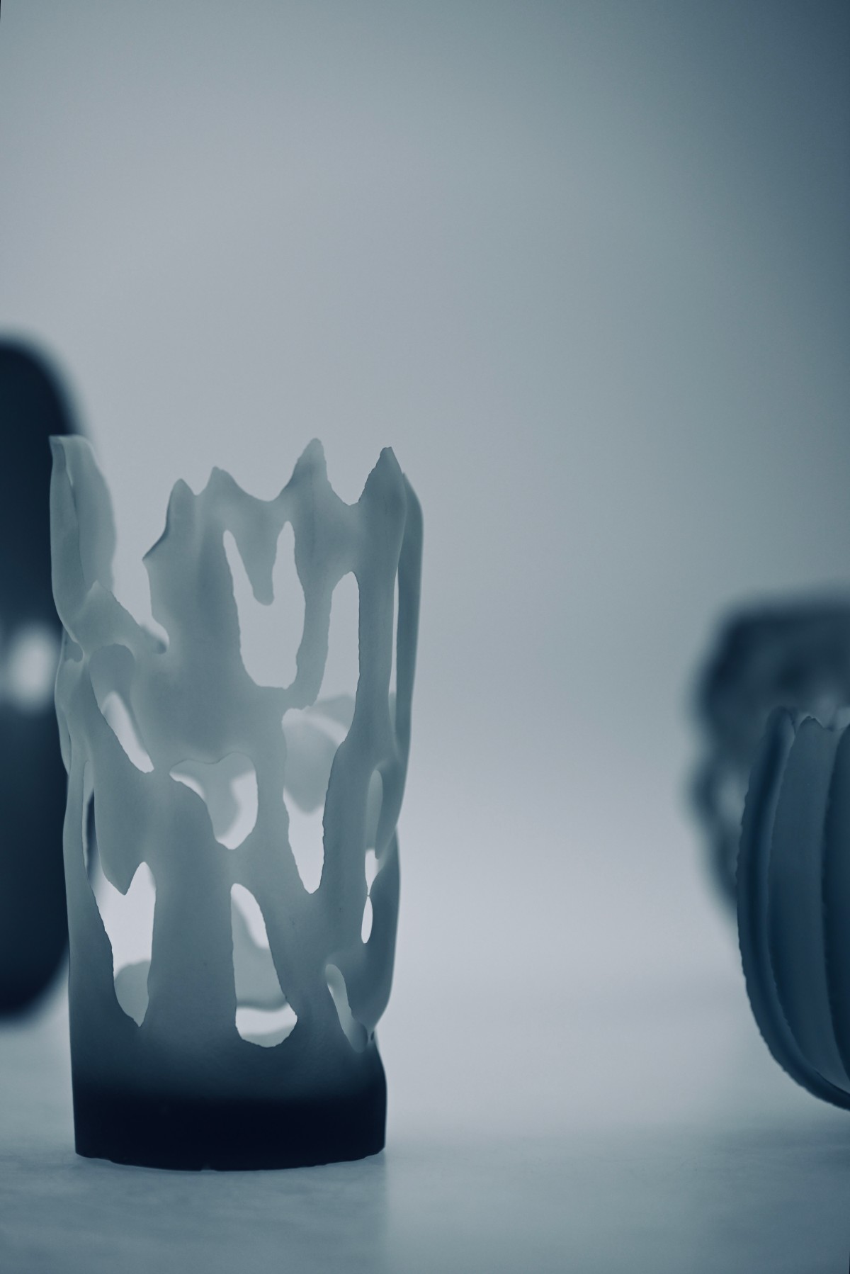 多摩美術大学工芸学科ガラス専攻 在籍「傷は、美しいか」をテーマに、サンドブラスト技法でガラスを削って生まれる形や表情を探究している。サンドブラストでガラスを削るとは、無数の傷をつけて造形することを意味する。「欠け、薄くなり、脆くなること」と「破綻すること」がせめぎ合うプロセスを超えたとき、吹いただけの「無傷」のガラスにはない新たな魅力が生まれる。無数の傷を重ねたからこそ生まれたガラスの形や表情を通して、傷とともに生きる私たちが、自分のことも美しいと思えるような作品を届けていきたい。