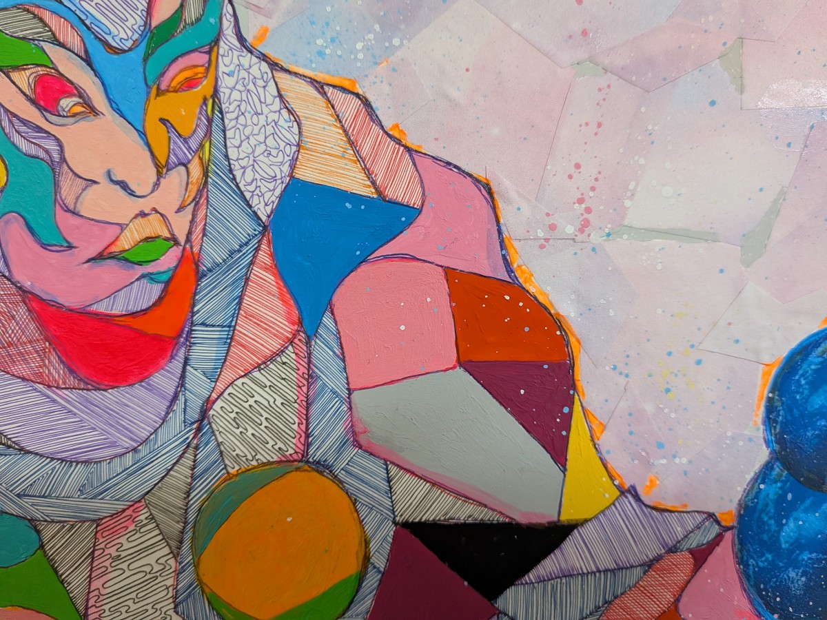 アクリルやボールペンを用い、線と色が交錯する独自の表現で、過去と現在、静けさと躍動が共存する世界を描き出しています。