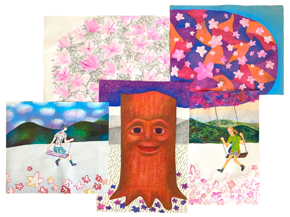 クレパスによるスクラッチやドローイングでは、塗り重ねと削りの行為を繰り返しながら、内面に潜む感情の層を可視化する。削ることで現れる色彩は、記憶の奥から立ち上がる光のようでもあり、時間の痕跡でもある。