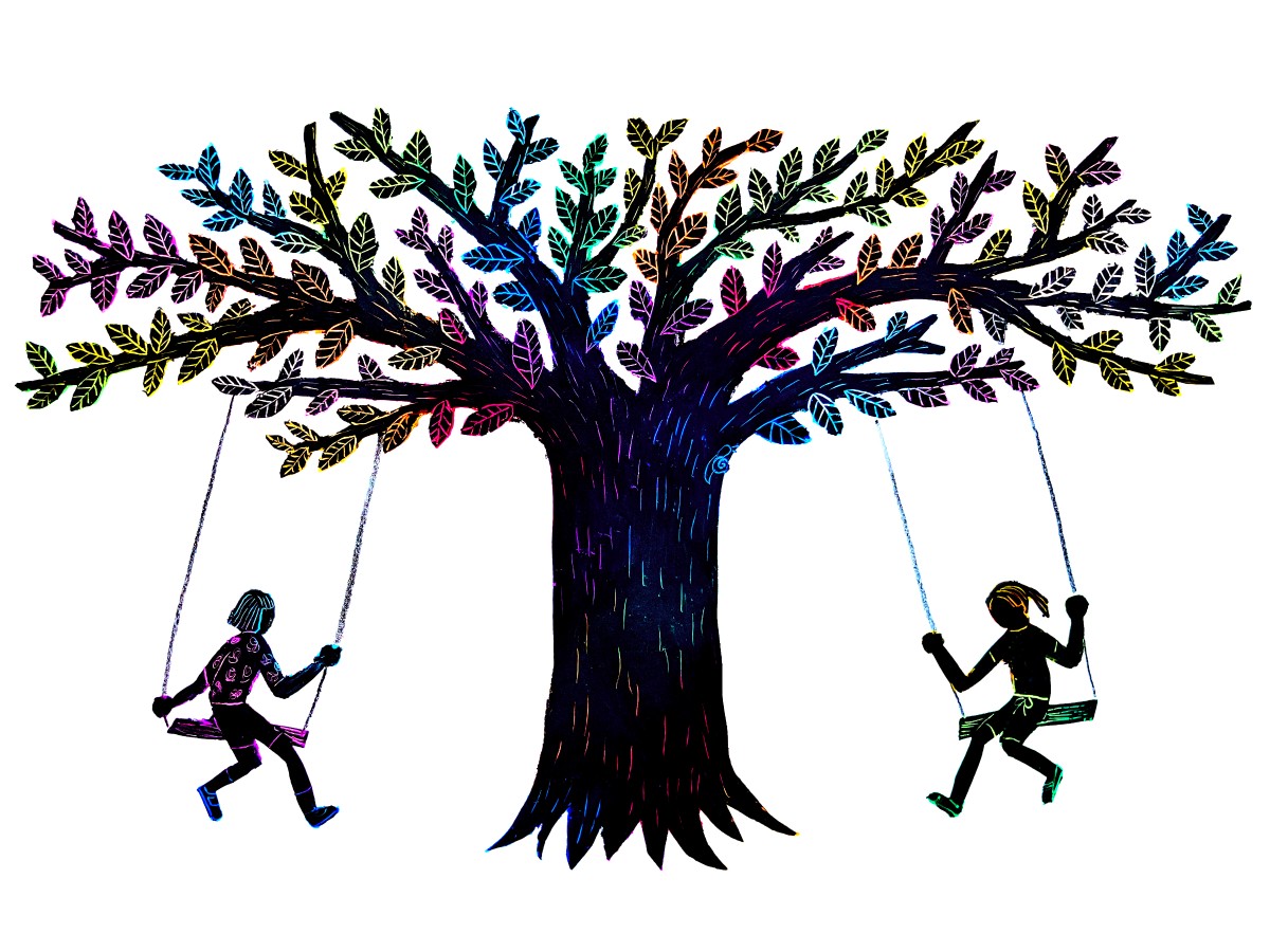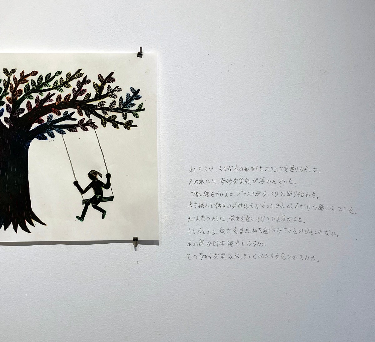 大きな木の形をしたブランコは、本作における象徴的モチーフである。木を挟んで互いの姿は見えないが、声だけが届く。回転するブランコの中で、私は彼女を追いかけているのか、それとも互いに追いかけ合っているのかと感じる。