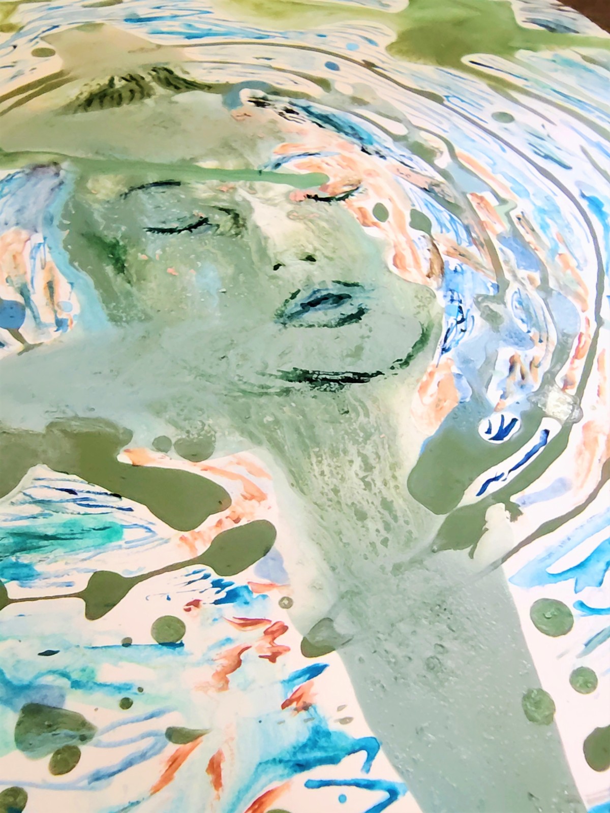 フルイドアートという絵の具の色や量によって、違う模様のできる技法を取り入れ、できた模様が自然の鏡面・水面のように感じ、想像を膨らませながら絵を描いていきました。