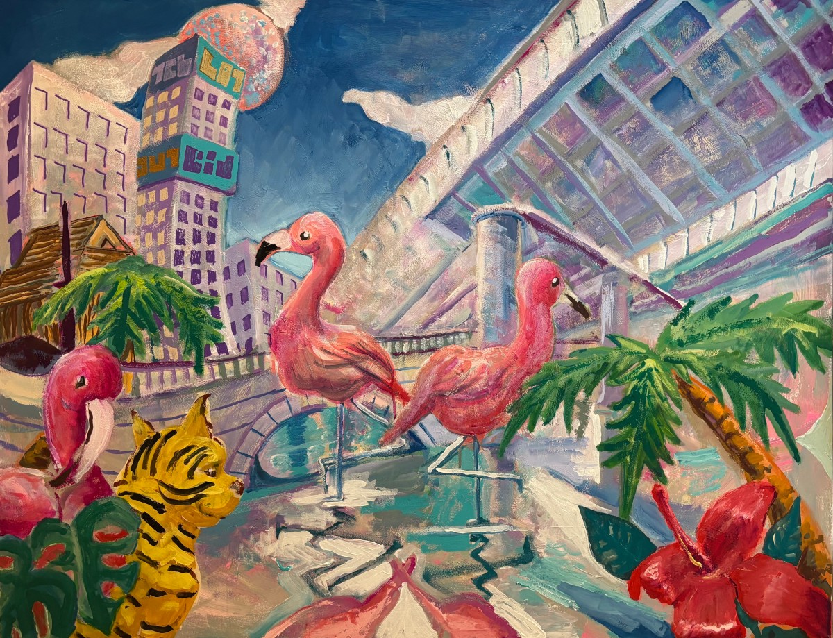 都市に佇む南国の香りのするフラミンゴを描いてみました。