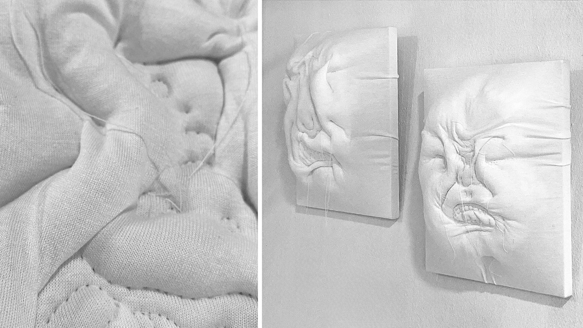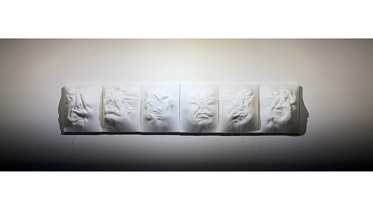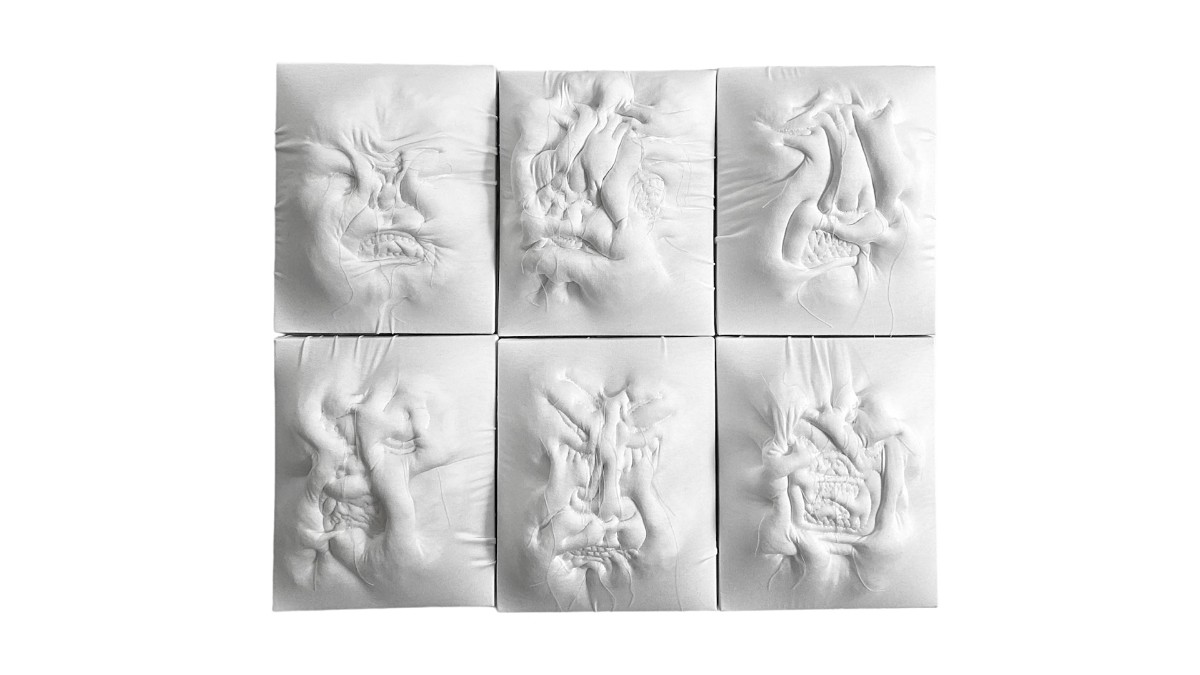 (27.5 x 22cm) x 6, Mixed media and fabric on canvas, 2023