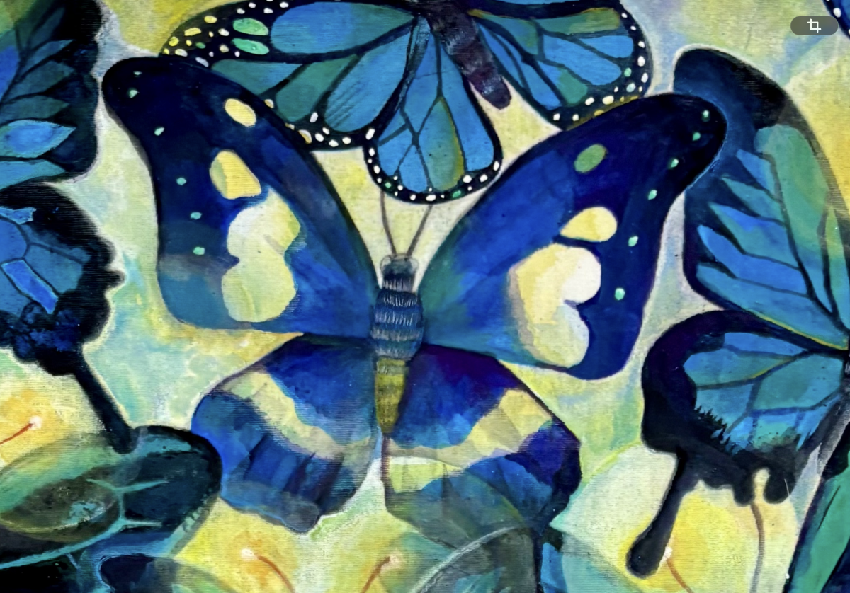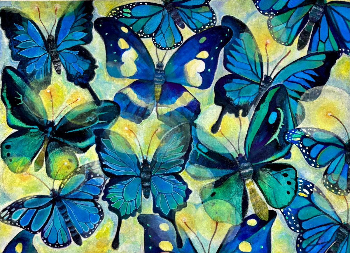 青い蝶の化身たちが空へ羽ばたいていく様子を描きました。蝶たちが照らすその先には一体何があるのか。