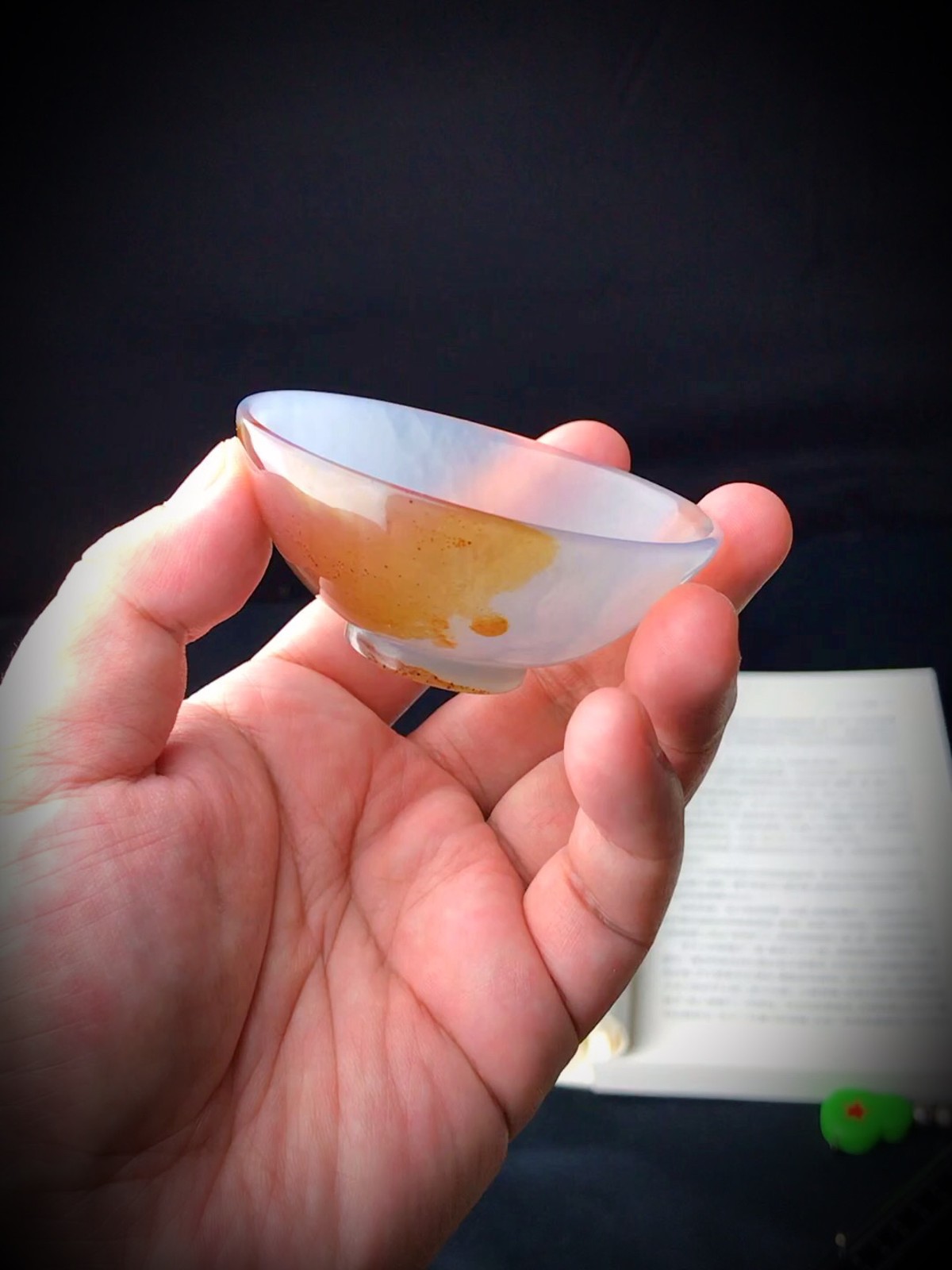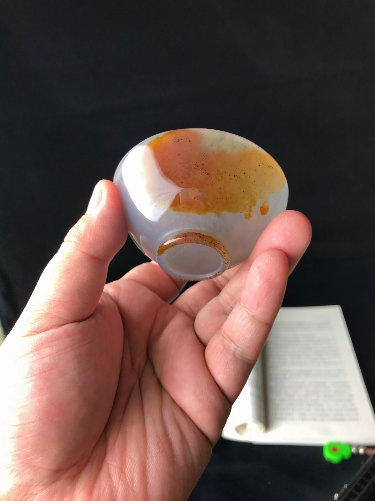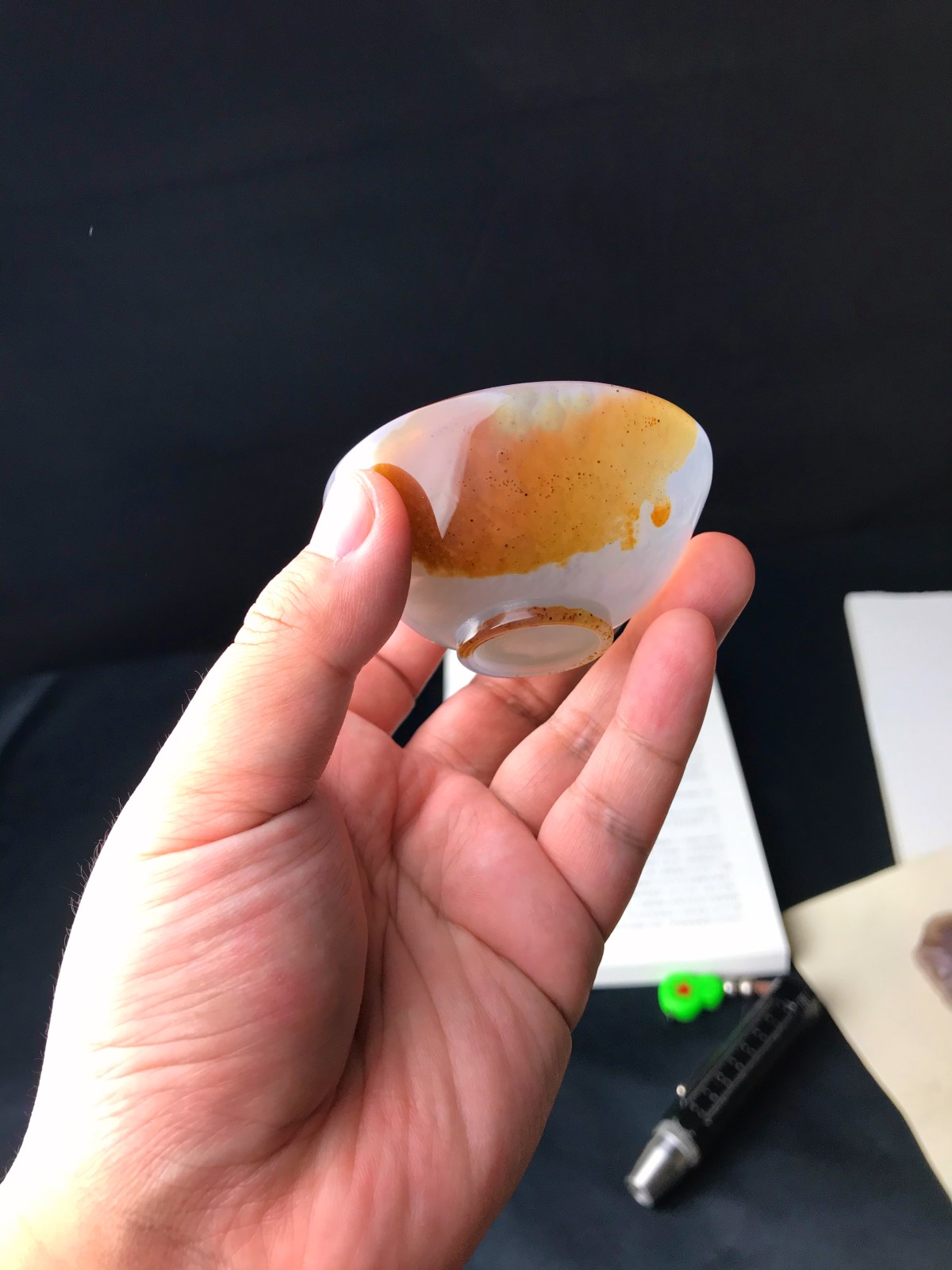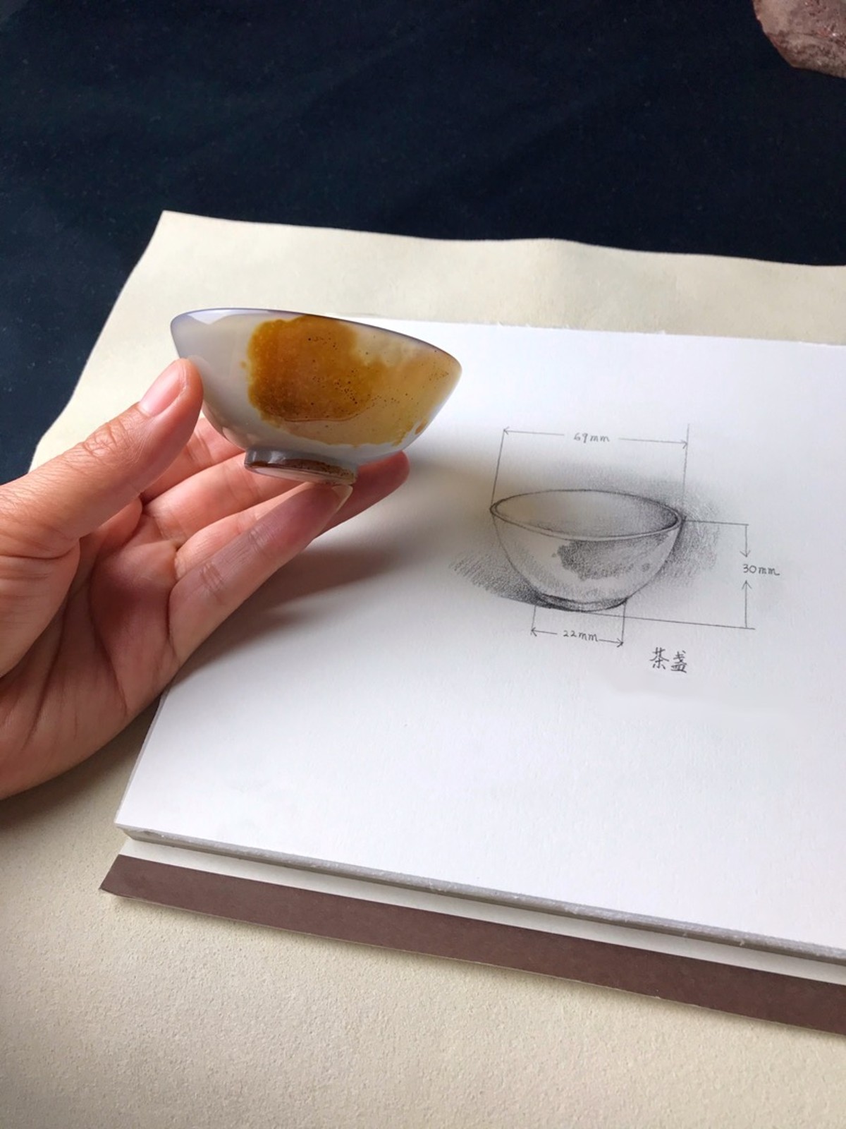 天然瑪瑙が持つ独特の色彩と模様に惹かれ、この素材をもとに茶盏を彫刻しました。